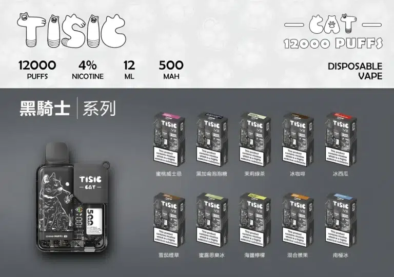 TISIC貓12000口以可愛貓咪外觀結合高規格配置,一機可輸出約12000口,滿足長時間外出與日常使用。內置大容量油倉與高效電池,免維護、免加油,開盒即用;多款水果、飲品與清涼系風味,讓每一口都充滿新鮮感。